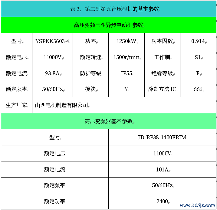 根据生产工艺要求,每条生产线有5台压榨机,第一台压榨机采用高压变频器一拖一高压电动机方式,高压电动机采用山西电机制造改善生产的变频三相异步电机,其基本参数如表1、表2 所示。