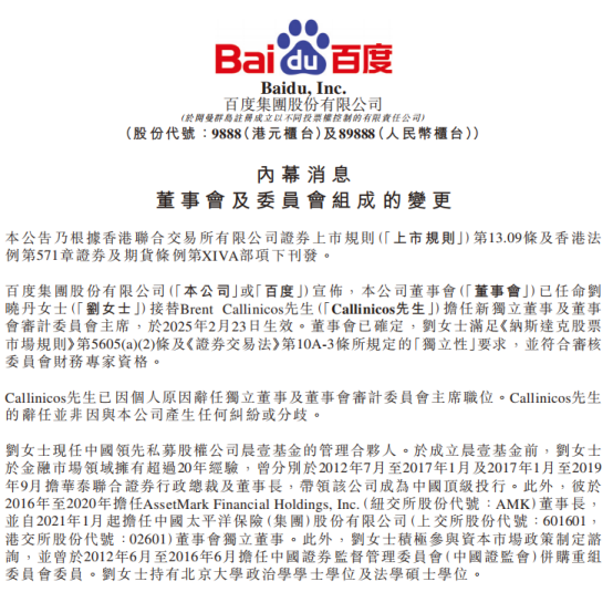 2月24日周一早间,百度集团在港交所发布公告宣布,任命刘晓丹接替Brent Callinicos担任新的独立董事及董事会审计委员会主席,该任命自2月23日起生效。随着刘晓丹的加盟,目前百度集团的董事会包括董事李彦宏,以及独立董事—联想杨元庆、金沙江创投丁健、纪源资本符绩勋、京东许冉,以及刘晓丹。