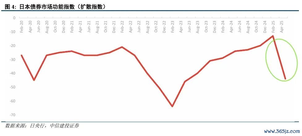 上周日本拍卖20年期国债,接盘的人突然减少,100块的东西必须要打折很多才能卖出去,债券市场功能指数加速恶化至-44。